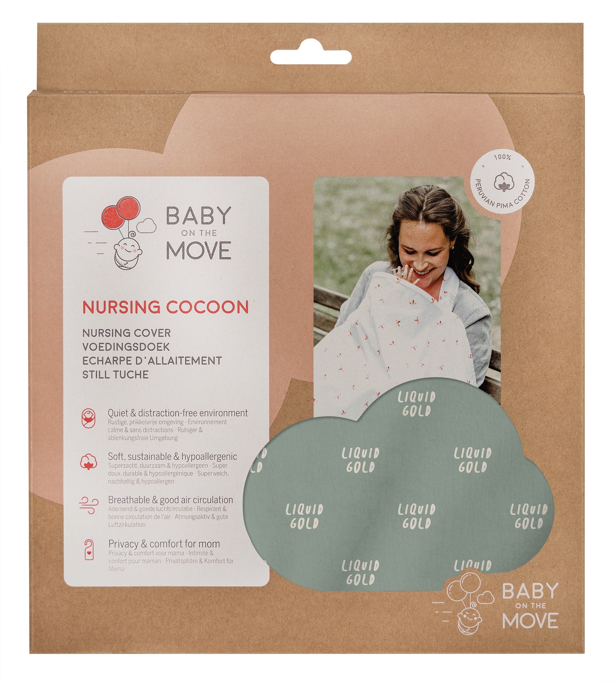 Our Baby on the Move premium Nursing Cocoon is made of 100% handpicked Peruvian Pima cotton. The original design with contoured neckline encourages you and your baby to continue breastfeeding comfortably while on the move.