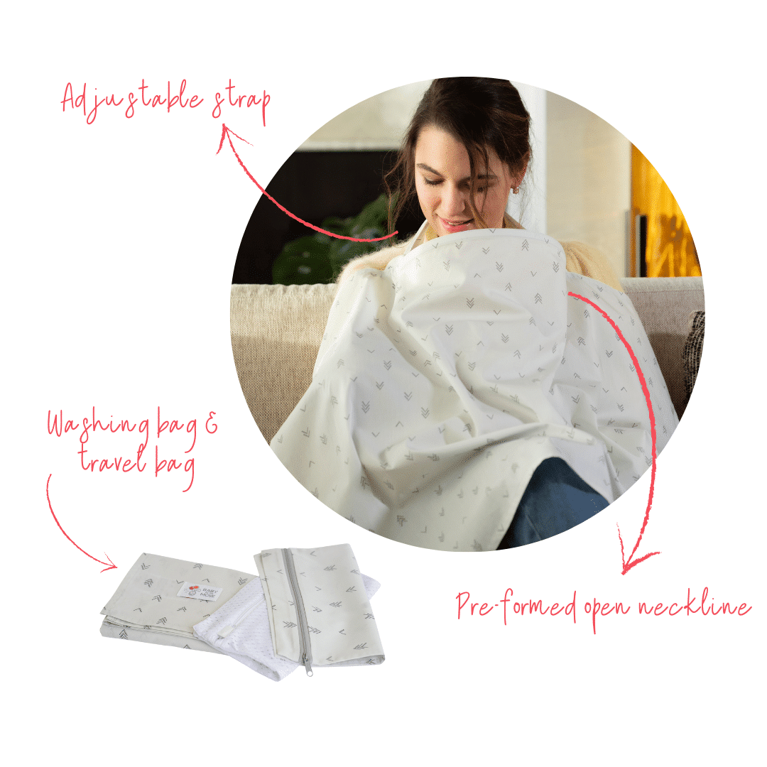 Our breastfeeding cover comes with a convenient washing bag and a matching on-the-go bag so that you can easily take your Baby on the Move Nursing Cocoon with you.