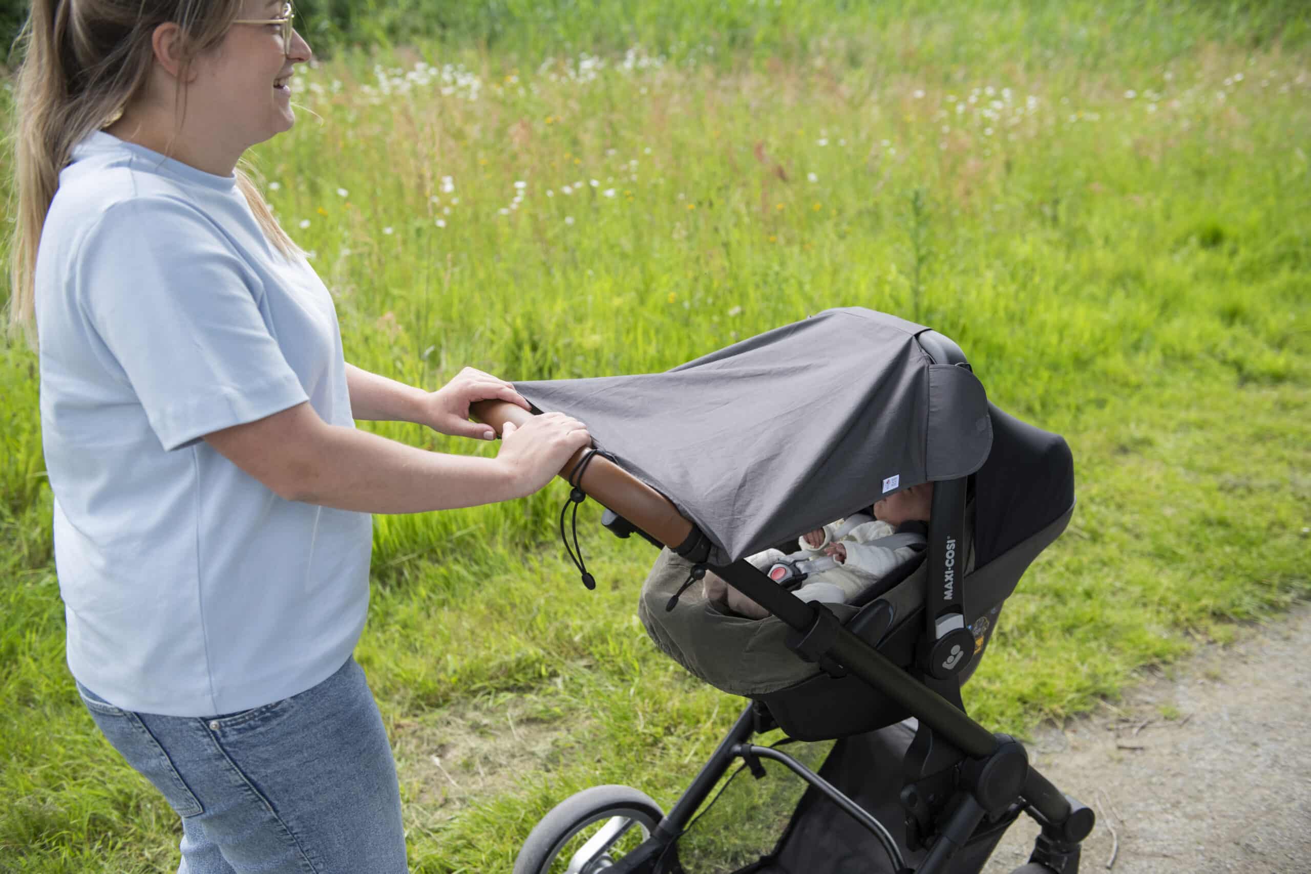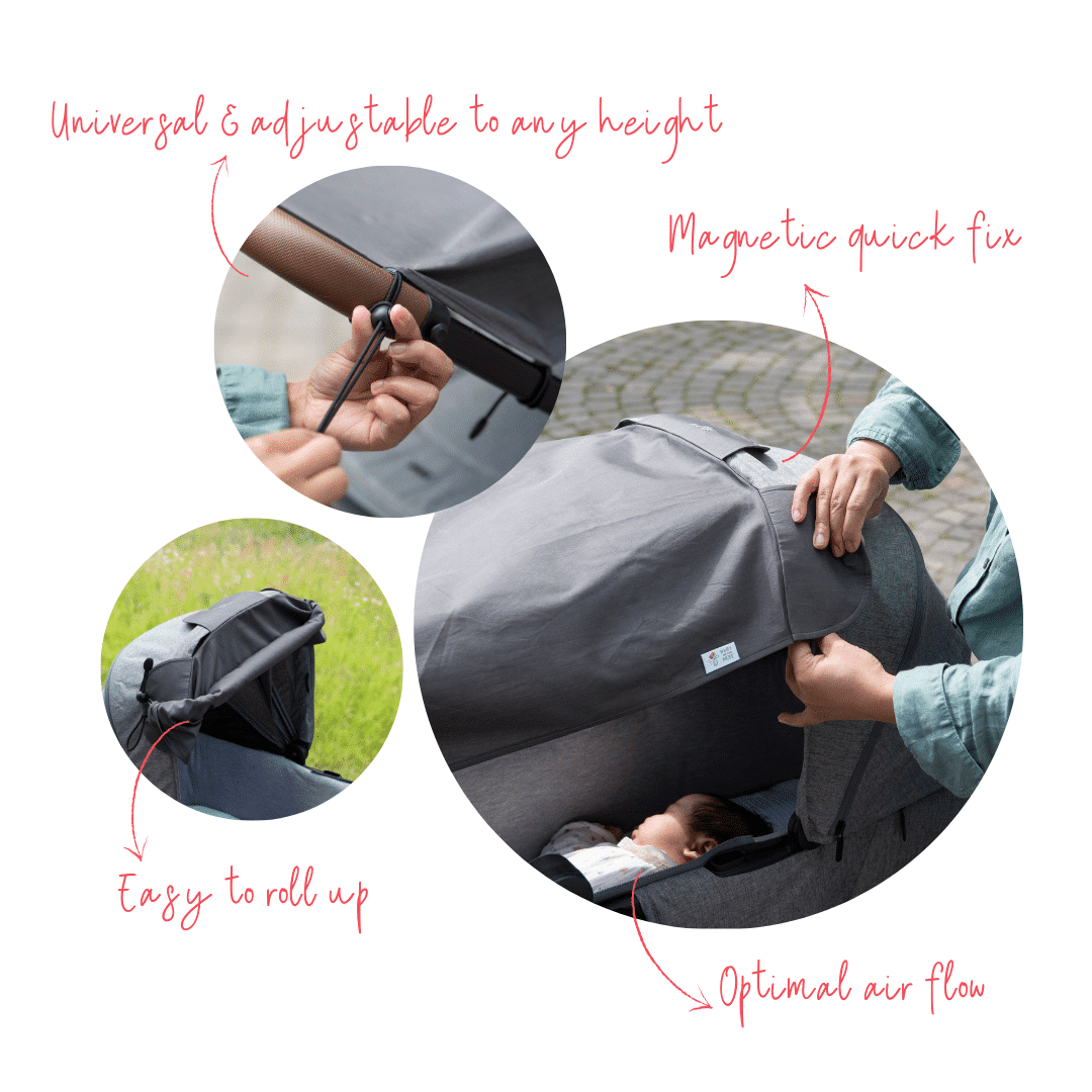 Our Baby on the Move Sun Cocoon is the ultimate solution for protecting your little one from harmful UV rays while on the go. The universal UV sunshade fits any pram and blocks >97% of UV rays without any chemical coating, making it the essential protection for your baby’s delicate skin. Made from 100% breathable Pima Cotton, the Sun Cocoon’s open design ensures optimal air flow, keeping your baby cool and comfortable, helping prevent overheating. Setting up is hassle-free thanks to its quick-fix magnets and easy roll-up system. Enjoy peace of mind with the Sun Cocoon, wherever your adventures take you!
