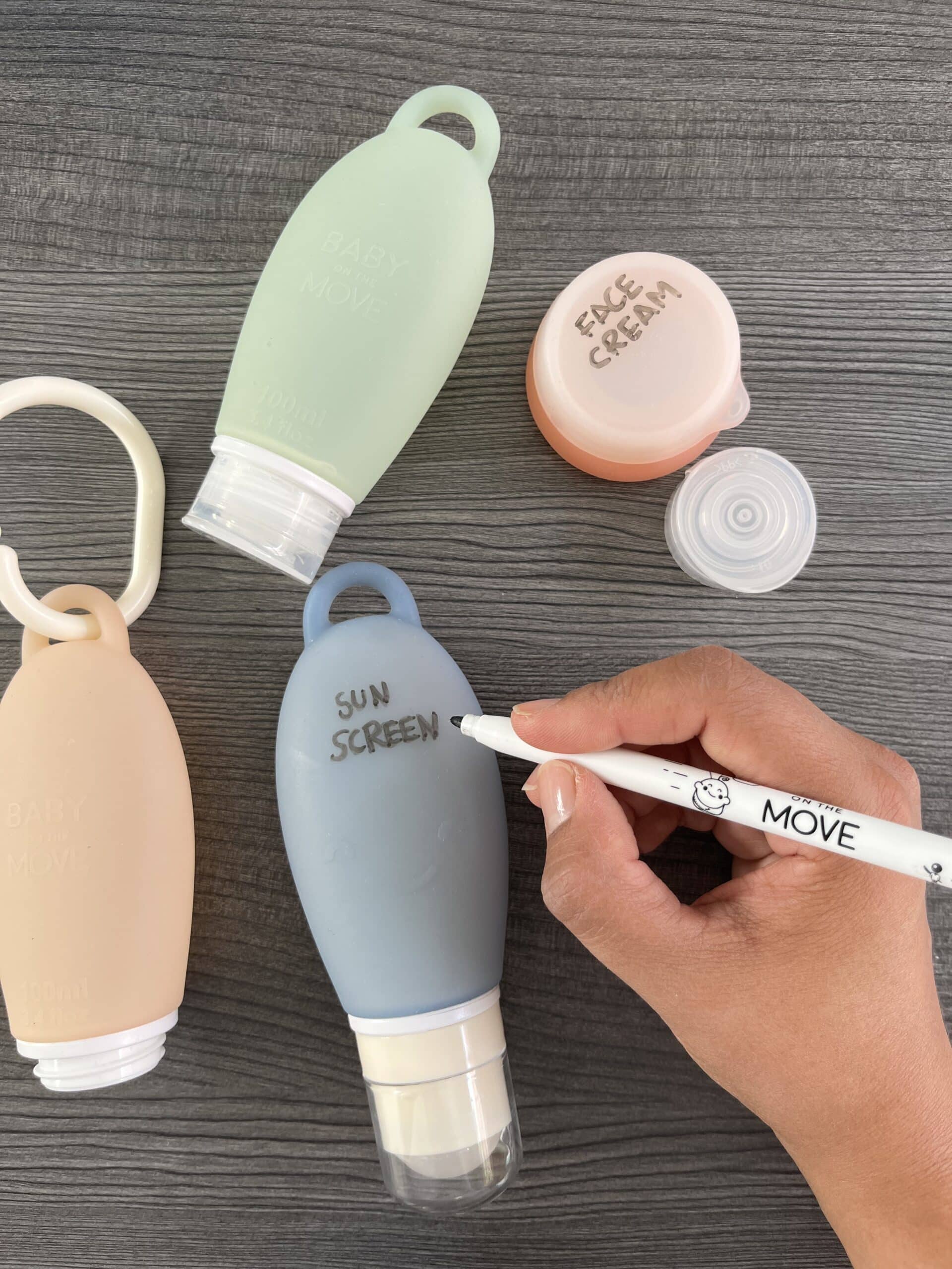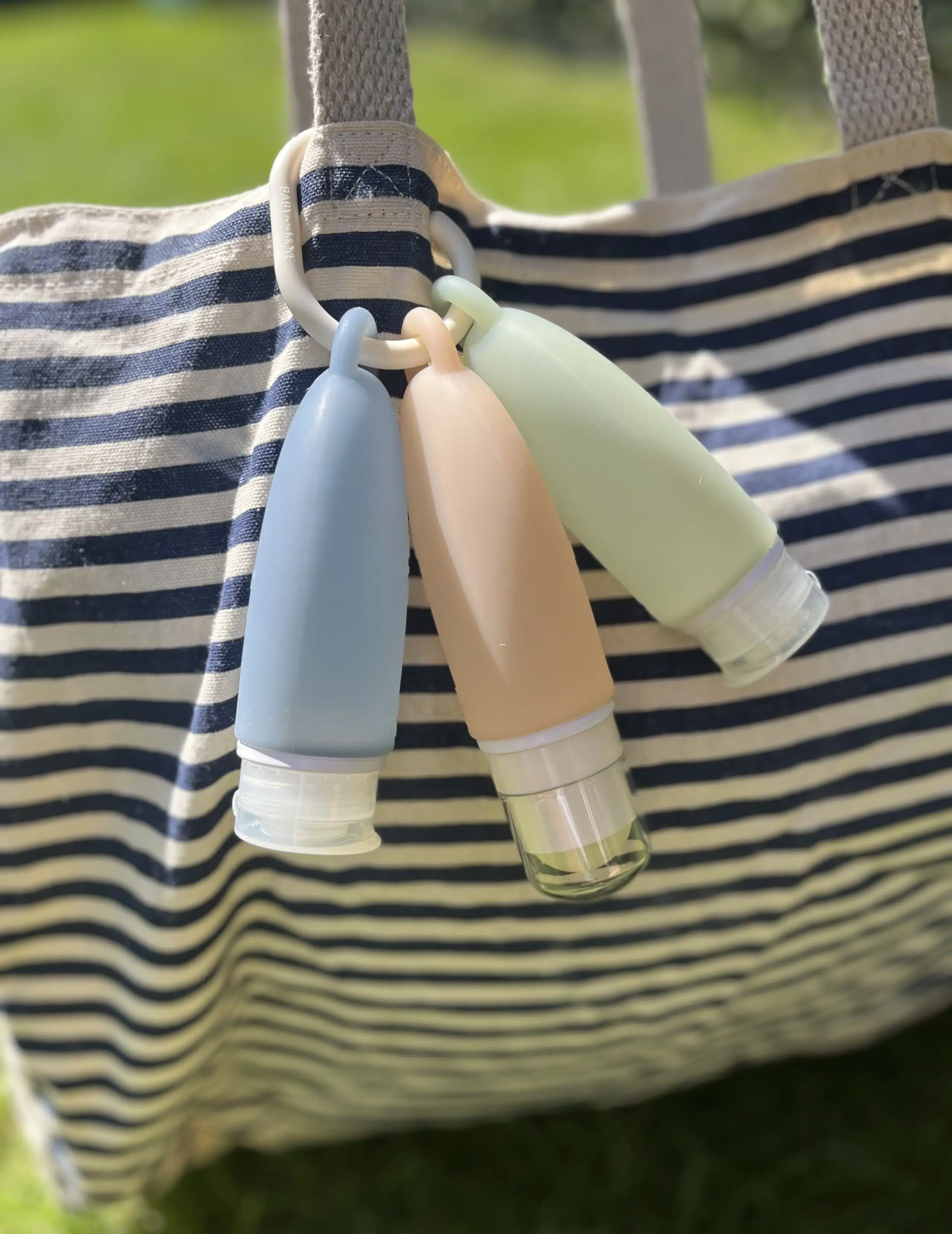 Our Travel Kit keeps your family essentials organized, leak-free, and always within reach! This compact set includes 3 color-coded bottles for everything from baby lotion to shampoo, plus a small jar that’s perfect for creams. The practical roller top makes applying sunscreen to wiggly little faces quick and tear-free. Use the handy ring to attach the bottles to your stroller or bag. Perfect for everyday needs or faraway adventures.