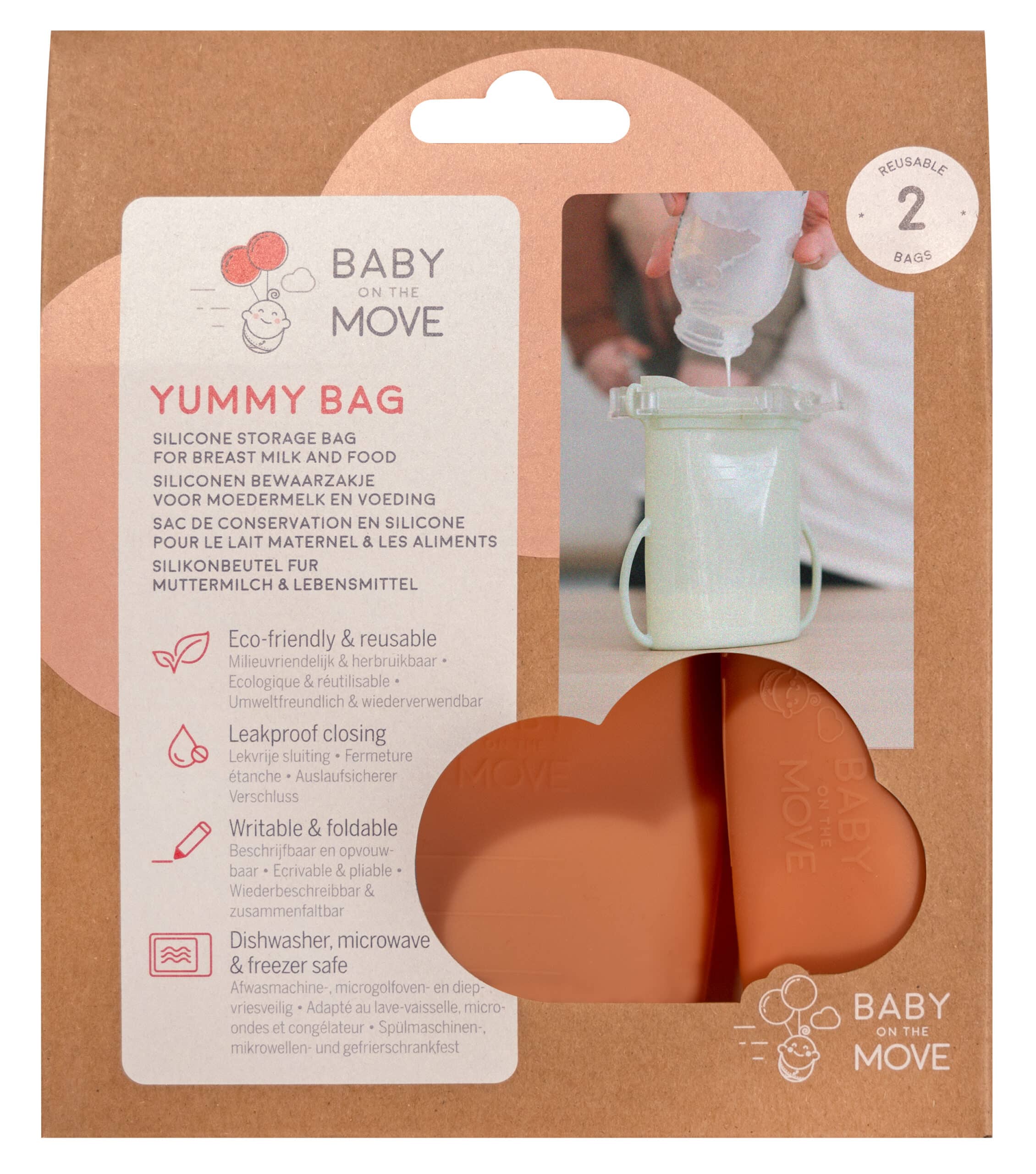Our Baby on the Move Yummy Bag is ideal for storing breast milk, baby purees and snacks. It is made of 100% food grade silicone. The original design and smart size make it perfect to store and carry your tasty treats everywhere without leaks.