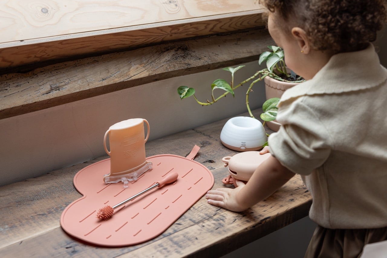 The Yummy Mat provides a hygienic surface for drying and doubles as a placemat for little ones on the go. The raised edges keep spilled water on the mat. Roll the mat up with the brush inside for easy storage and transport, or use the handy strap to hang it up to dry. It fits effortlessly into any diaper bag, kitchen drawer, or suitcase, so you’re always prepared, no matter the situation. It’s made of dust-repellent silicone, which means that no annoying hairs or other dirt sticks to the mat and keeps it clean.