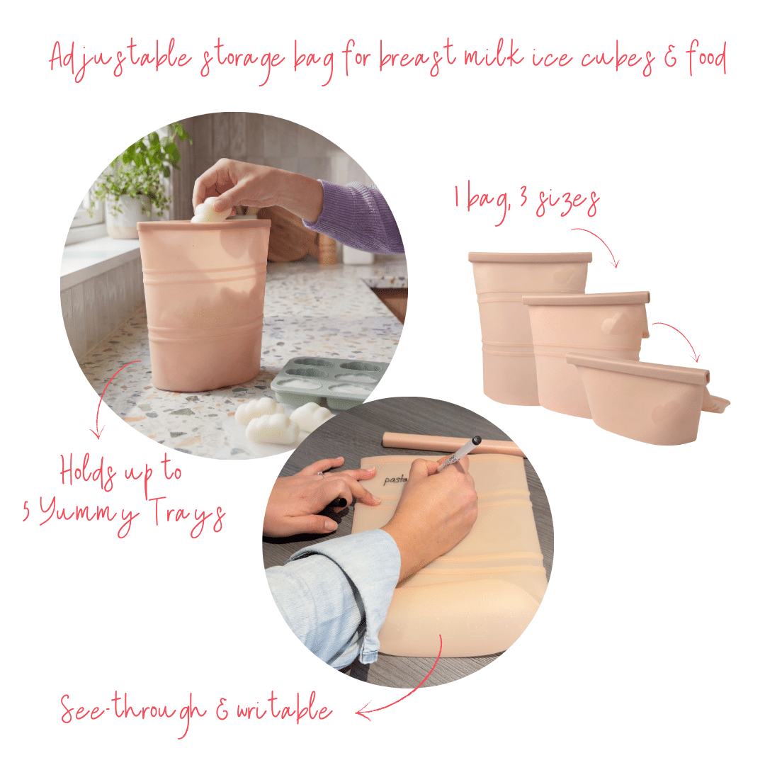 Our Yummy Storage bag makes breast milk storage easy. Transfer frozen cubes straight from the Yummy Tray (or any freezer tray) to build your long-term supply. With three adjustable closure levels, you can start small and expand as your stash grows. This keeps your freezer hygienic, practical, and tidy. Also great for fruit and veggie cubes, sauces, and more. Durable, reusable, and made to grow with your family.